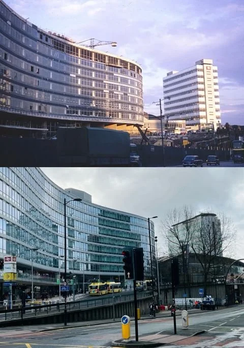 The top image, circa 1967, showcases the significant construction underway at the time, including the delivery of Gateway House, designed by architect Richard Seifert and completed in 1969.